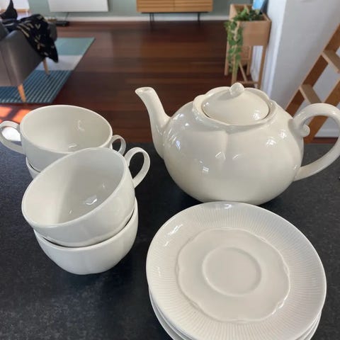 Materiale: Fremstillet i hvidt porcelæn, som tåler både opvaskemaskine og mikrobølgeovn .