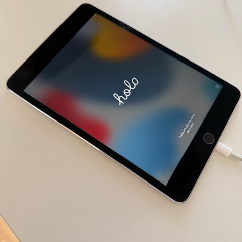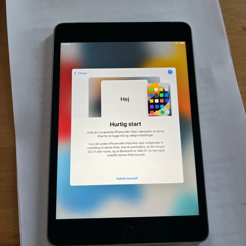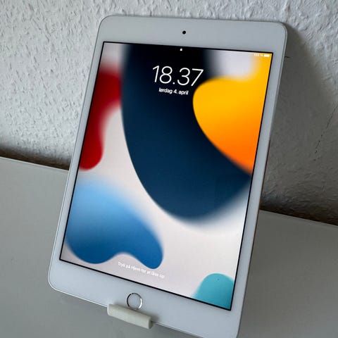 Apple iPad mini 4 tablet med 32 GB intern hukommelse. Modellen er iPad mini 4, som har en kompakt skærmstørrelse, velegnet til brug på farten, streaming, lette spil og internetbrug.