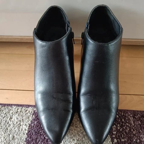 Frække ankelstøvler med spids næse og høj hæl. De har aldrig været ude og gå. Der er et mærke på den ene hæl, efter opbevaring.