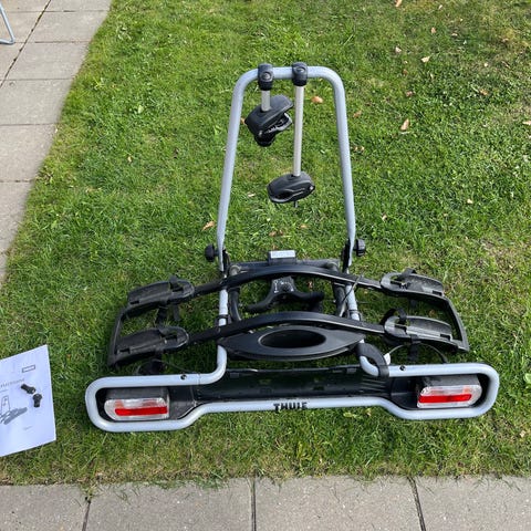Thule EuroWay 923 cykelholder til montering på anhængertræk. Cykelholderen er beregnet til transport af op til 3 cykler. Ifølge typeskiltet har modellen en egenvægt på ca. 18,4 kg og en maksimal lastekapacitet på i alt 51 kg. Holderen har integrerede lygter bagtil og skinner med remme til fastgørelse af cyklernes hjul samt arme til fastspænding af stel. Velegnet til personbiler med anhængertræk, hvor der er behov for transport af flere cykler på længere ture eller i hverdagen. Har kun været brugt en håndfuld gange. Der medfølger et vægophæng for nem opbevaring.