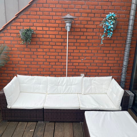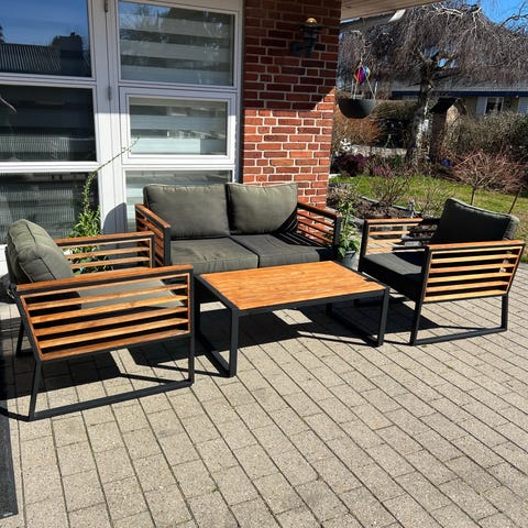 loungesæt i mørk flet med grå hynder. Sættet består af 3-per. loungesofa, bord og 2 stole. Velegnet til udendørs brug på terrasse, altan eller i have. Hynderne er polstrede sædehynder i ensfarvet grå. Sættet er en sæson gammelt og har kun stået på en lukkede altan.