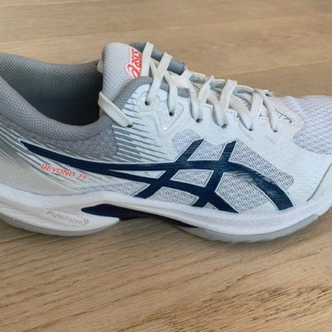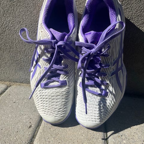 Asics tennissko i str. 40,5. Skoene er i farverne hvid og turkis med mønstret overdel og kraftig ydersål med sildebensmønster, velegnet til tennisbaner. Snørelukning og polstret hælkappe for støtte og komfort. Velegnet som tennissko eller andre indendørs/udendørs sportsaktiviteter, hvor der er behov for god stabilitet og greb.