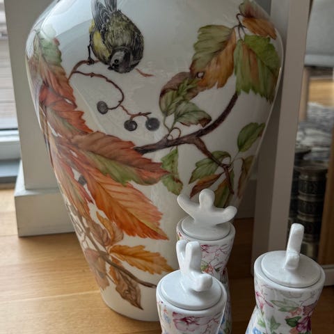 Porcelænsvase i blå-hvid dekoration med blomstermotiv og fugl på forsiden. Vasen har en klassisk, slank form med bred åbning og markeret fod. På siderne er der påsat dekorationselementer i blå glasur. Indersiden er glaseret i lys tone. Velegnet som gulvvase eller til større blomster- og grenarrangementer samt som dekorativt element i indretningen.