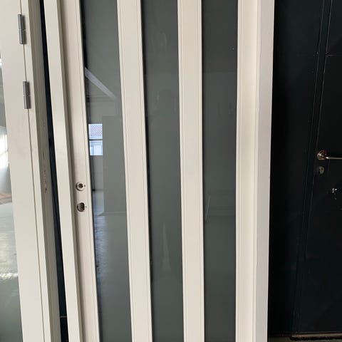 Scandiline TRAL-F3-13 facadedør i træ/alu med 3 glasfelter. Døren har udvendig og indvendig hvid profil og måler ca. 93,4 cm i bredde og 217,3 cm i højde. Konstruktionen er i træ med udvendig aluminiumsbeklædning og matteret glasfelter, som giver lysindfald med afskærmet indkig. Velegnet som facadedør i bolig eller tilbygning, hvor der ønskes en enkeltfløjet dør med glasfelter.