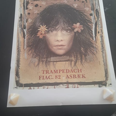 Trampedach New York 74 plakat med motiv i varme røde og brune nuancer. Plakaten viser en figur øverst og et ansigt nederst i kompositionen. Nederst på plakaten står teksten "Trampedach New York 74". Plakaten er indrammet i en enkel, mørk træramme med glas. Velegnet til ophængning i stue, kontor eller andre opholdsrum som vægdekoration.mål ca 1mx1.20