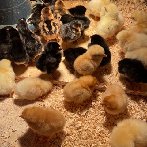 Daggamle kyllinger i blandede farver. Kyllingerne fremstår små og nyklækkede. Ingen specifik race eller køn.