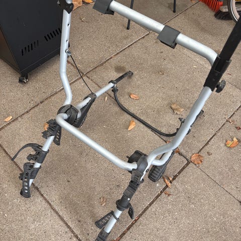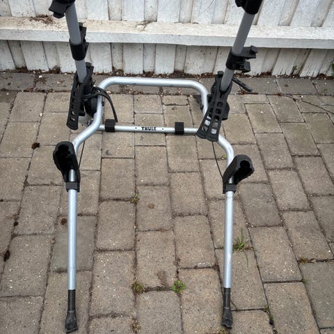 Thule cykelholder til montering på anhængertræk. Cykelholderen har metalramme med polstret midterstykke og justerbare arme med plastikholdere til fastgørelse af cykler. Velegnet til transport af cykler bag på bilen