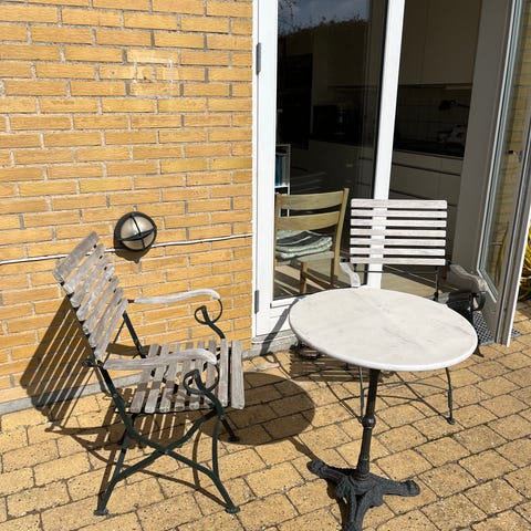 Trip Trap havesæt med bord og bænke i hvidmalet træ. Sættet består af et spisebord samt to bænke. Velegnet til terrasse eller have som spise- og siddeplads. Designet med lige linjer og klassisk udtryk, der passer ind i mange udemiljøer. Bord måler 85x190 cm bænke længde 200 cm . Virkelig pæn stand - lidt brugsspor . Lyse hynder medfølger til begge bænke.