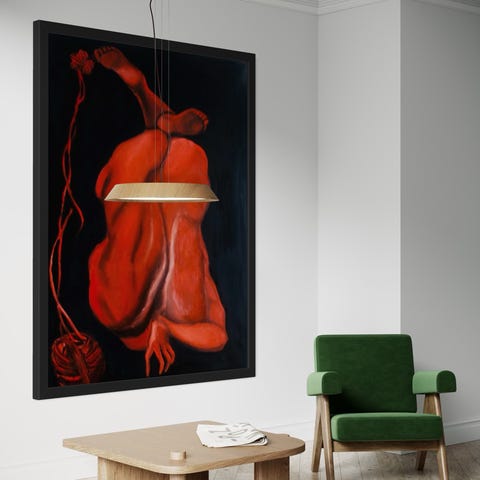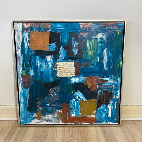 Abstrakt maleri i blå og pink nuancer af ukendt kunstner. Motivet består af organiske former og grafiske elementer i kontrastfarver. Billedet fremstår som et moderne, non-figurativt kunstværk, velegnet til ophængning i stue, kontor eller andre opholdsrum. Maleriet er indrammet, som det fremgår af billedet.