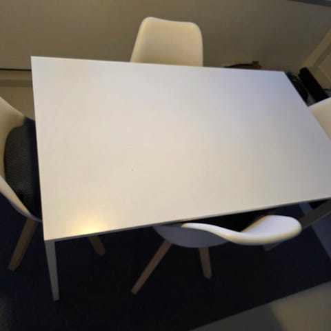 Rektangulært spisebord i hvid med metalben. Bordpladen er lys og glat, egnet til køkken eller spisestue. Benene er i metal og placeret i hjørnerne for stabilitet. Velegnet som spisebord til flere personer eller som arbejdsbord i hjemmet.