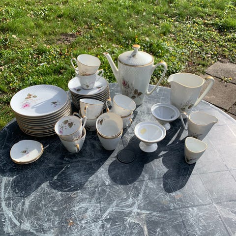 Fad, kande, flødekande og sukkerskål uden låg og en lille cigaretholder