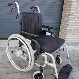 Letvægts sportskørestol med fast ramme. Sæde og ryg er i sort polstret materiale, og stolen har kulfiber sideplader. Baghjulene har røde eger og sorte fælge, og forhjulene er små drejehjul, som gør stolen manøvredygtig. Egnet til aktiv brug, fx sport eller daglig kørsel, hvor lav vægt og god styring er vigtig.