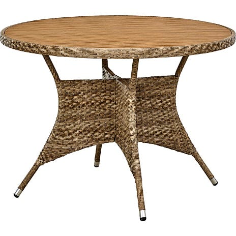 Havebordet har en bordplade i nonwood med en diameter på 105 cm og et stel i natur farvet polyrattan.