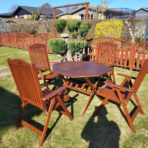 Spisebord og 4 spisebordsstole i akacietræ. Holdbart og elegant design, perfekt til både udendørs og indendørs brug.
