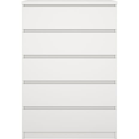 Kommoden er udstyret med 5 rummelige skuffer, som giver god plads til opbevaring af tøj, legetøj eller sæsonbetonede ting. Den kompakte størrelse gør den velegnet til mindre rum, hvor pladsen skal udnyttes optimalt.