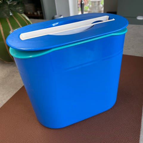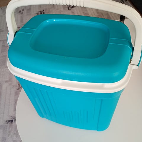 køleboks i blå plast med hvidt låg og bærehåndtag. Velegnet til opbevaring og transport af mad og drikke, f.eks. til picnic, strandtur eller camping. Robust plastkonstruktion, der gør boksen nem at rengøre og flytte rundt på. Uden el og motor