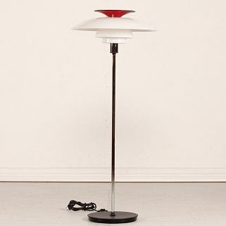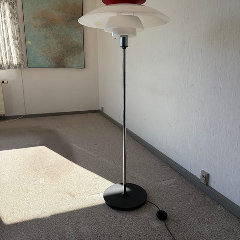 Opal acrylic skærm. H 132 Ø 56 cm. Flot stand forkromet stamme. Et lille stykke er slået af den øverste skærm men ses ikke. 2 trin lyddæmper. Kontakten virker lidt løs.