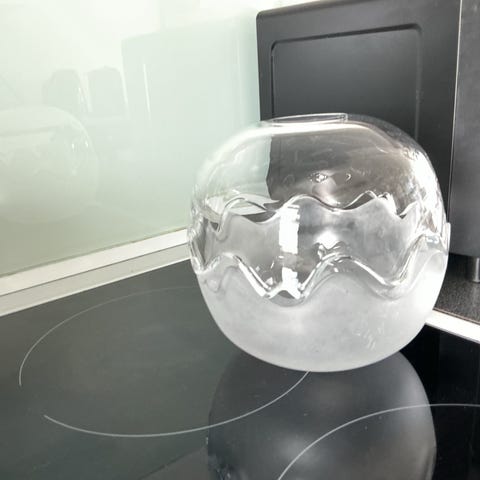 Den består af to takkede halvdele – en i klart glas og en i sandblæst matteret glas – som passer sammen som skallen på et tvedelt æg.