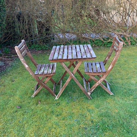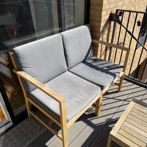 Jeg sælger 1 stk. havebord og to klapstole i træ inkl. hynder. Egner sig perfekt til altan eller terrasse som udendørs spise- eller siddepladsesæt.