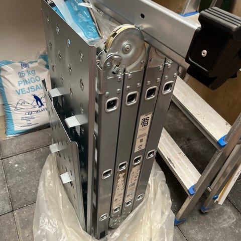 Materielhuset stige. Robust stige med metalsider og trin, egnet til arbejde hvor der er behov for adgang i højden. Stigen fremstår med advarselsmærkater om elektricitet og er beregnet til brug i miljøer med teknisk udstyr eller installationer. Velegnet til professionelt brug på byggepladser, værksteder eller lignende arbejdsområder, hvor en stabil stige er nødvendig.