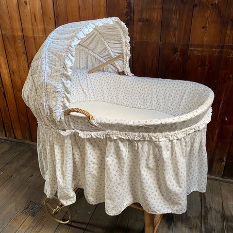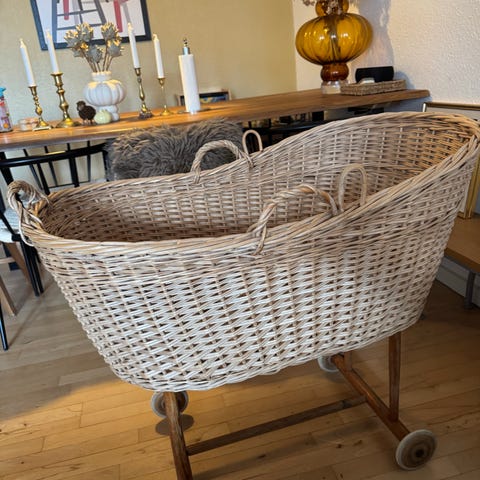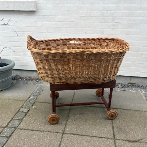 Vugge i flettet rattan i naturfarve på træstel med hjul. Vuggen har ovalt leje med madras og bærehanke i siderne. Egnet til spædbørn som soveplads i hjemmet. Konstruktionen består af flettet kurv monteret på et stabilt stel i træ med fire hjul, så vuggen kan flyttes efter behov.