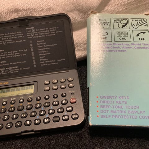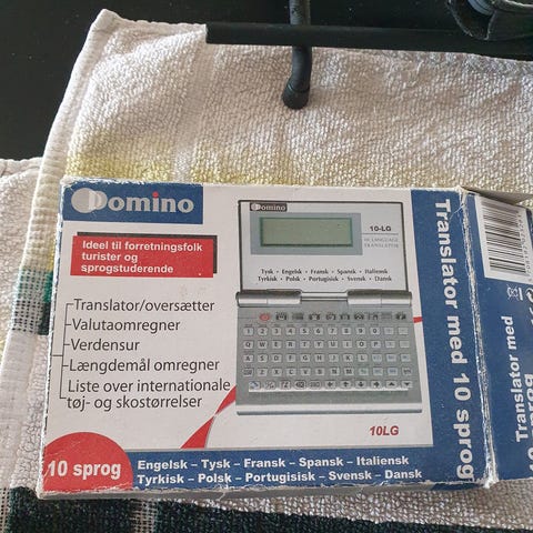 Franklin Translator elektronisk ordbog i sort. Enheden har display øverst og tastatur med tal og bogstaver til indtastning af ord. Leveres med hårdt etui/cover og brugervejledning som vist på billederne. Egnet til hurtig opslag af oversættelser på farten eller ved skrivebordet.