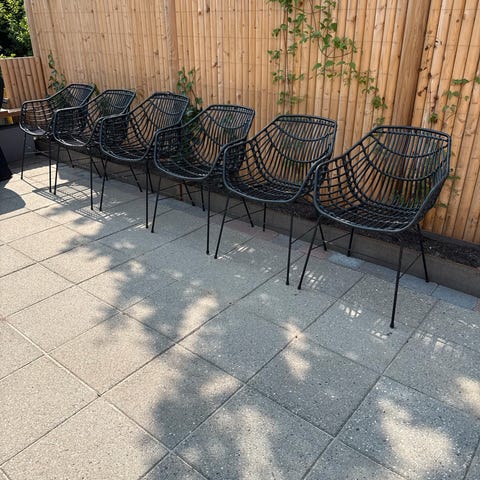 Formen er skålformet med armlæn integreret i sædet, hvilket giver støtte til ryg og arme. Velegnet som spisebordsstol, ekstra stol i stuen eller på overdækket altan/terrasse efter behov og materialets egenskaber.