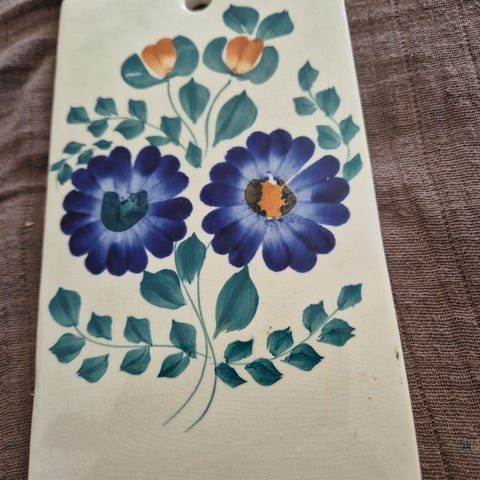 Manglebræt med blomsterdekoration og metalskilt med initialer, 23 x 5 cm.
