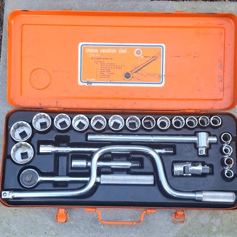 Chrome molybdenum steel topnøglesæt med skraldenøgle i orange metalkasse. Sættet indeholder flere toppe i forskellige størrelser, forlængere og tilbehør til brug med medfølgende skraldenøgle. Egnet til generelt mekanisk arbejde, reparation og vedligeholdelse, hvor der er behov for forskellige topnøgler samlet i én kasse.