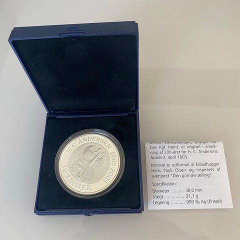 H.C. Andersen "Den Grimme Ælling" 10 kr, 1 Troy oz (31,1g) finsølvs mønt, i original æske.