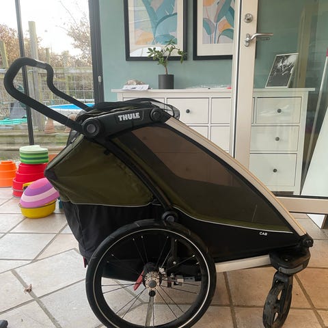 Thule Chariot lader dig opleve nemme overgange mellem cykling, gåture og løb. En hurtig, enhåndsbetjent 180 graders hjulrotation forvandler cykelanhængeren til en klapvogn på få sekunder. Regnslag er også med. Den er meget velholdt. altid stået indendørs.