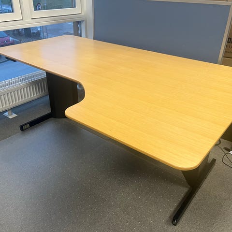 Hæve sænkebord skrivebord med bordplade i lyst træ og gråt stel.