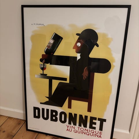 Vægplakat med ramme med klassisk Tuborg Pilsner motiv. Plakaten viser en illustreret scene med bil, servering og teksten “Tuborg Pilsner – fremad overalt”. Den er indrammet i en rektangulær ramme med glas og ophængssnor på bagsiden, klar til ophæng på væg. Velegnet som dekoration i køkken, stue, barområde eller andre rum, hvor man ønsker et grafisk udtryk med øl- og reklamehistorisk motiv. 60 x 47 cm.