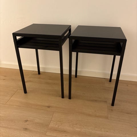 To hvide natborde/sengeborde med skuffe og nederste hylde. God stand, rene og stabile. Perfekte ved sengen.