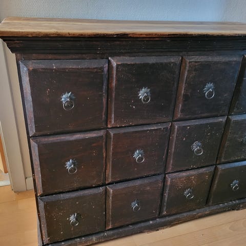 Flot og dekorativ skuffereol i købmandsdisk-stil med hele 16 rummelige skuffer. Perfekt som både praktisk opbevaring og et unikt møbel i bolig, butik eller værksted.