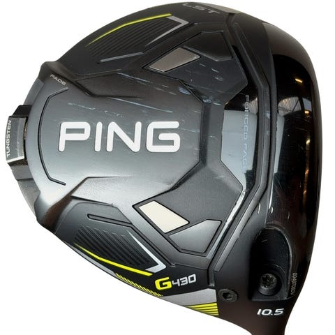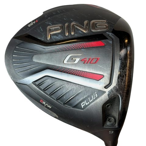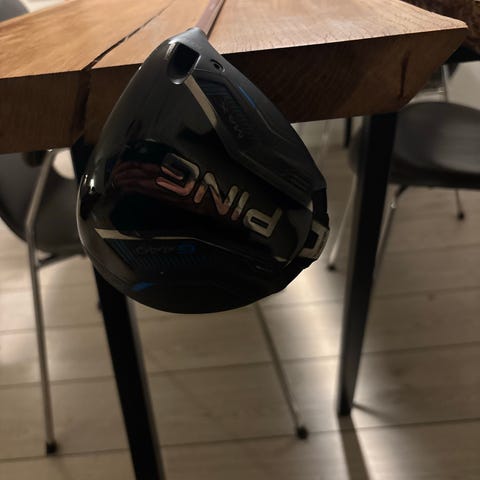 Ping i15 driver med 8 loft Køllehoved i metal med sort finish og markeringer på slagfladen. Skaftet er orange med sort og gråt grip.