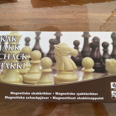 Skaksæt i plast med sort/hvidt bræt og matchende brikker i sort og hvid. Brættet er foldbart og måler ca. 35 cm på hver side. Felterne er markeret med bogstaver og tal langs kanten. Sættet indeholder et komplet sæt skakbrikker til to spillere, som kan opbevares i poserne og inde i det foldbare bræt. magnetisk skakspil