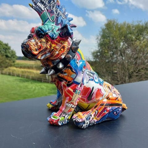 En have- og havebgedenskulptur i polyresin med titullen funny dog with sunglasses in gold color, 60 cm høj, 43 cm dyb og 31 cm bred, fra Europa, ikke signeret og i fremragende stand. Klik på den blå "gå til varen" knap, for at købe eller byde på denne vare. Den samlede pris vil blive vist inden du afgiver dit bud.