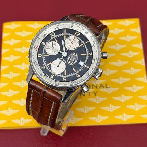 Breitling Old Navitimer A13022 automatisk herreur i rustfrit stål, 41 mm kasse, sort skive, læderrem (180–200 mm), produceret i 1995, i god stand med synlige brugsspor. Original æske, papirer og garanti inkluderet. Klik på den blå "gå til varen" knap, for at købe eller byde på denne vare. Den samlede pris vil blive vist inden du afgiver dit bud.