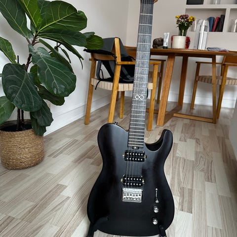 Kroppen er lavet af poppel med en tykkelse på 45 mm, hvilket giver en letvægtig og resonant klangbund med klar mellemtone-respons. Halsen er konstrueret af karboniseret ahorn, hvilket bidrager til stabil sustain og en velafbalanceret tone. Instrumentet har en 648 mm skala og 24 bånd, hvilket gør den ideel til både rytme og soli.
