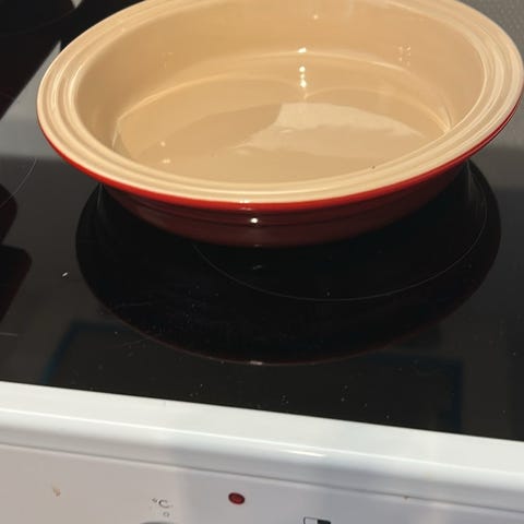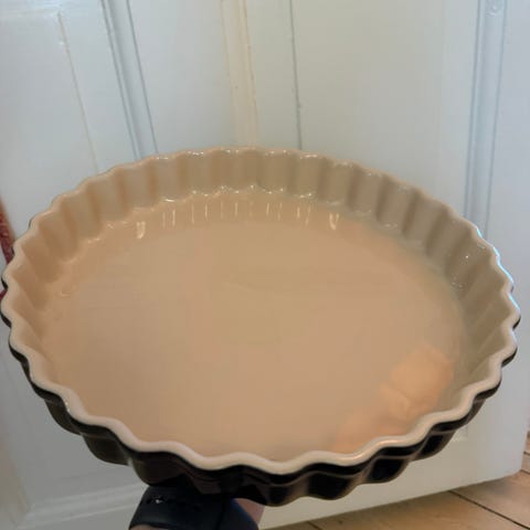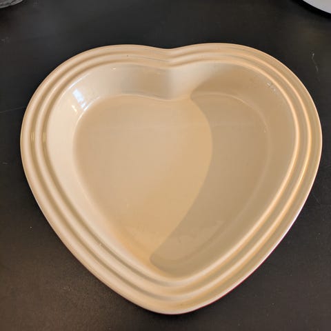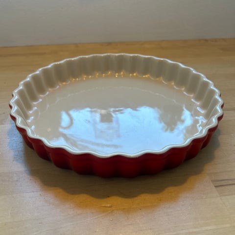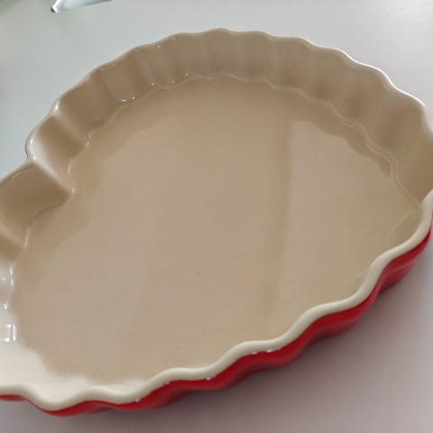 Le Creuset tærtefade i keramik. Sættet består af to fade med bølget kant, et rundt og et hjerteformet. Begge fade er udvendigt røde og indvendigt lyse. Velegnede til bagning og servering af tærter og andre ovnretter.