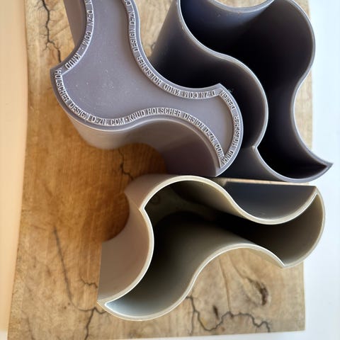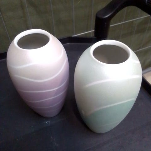 Vaser, To små vaser. Den ene er hvid med røde pletter. Den anden cylinderformet og er grøn med detaljer i glasuren.
