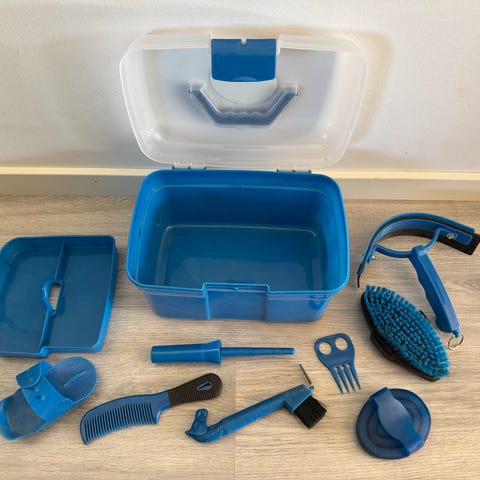 Rideudstyr striglekasse med tilbehør i lilla plast. Kassen har bærehåndtag og gennemsigtigt låg. Indvendigt er der ruminddeling og indsatsbakke til opbevaring af småting. Sættet indeholder blandt andet børster, hovrenser, tov og et par lilla og pink plast-sandaler. Velegnet til opbevaring og transport af strigler og mindre rideartikler i stalden eller på tur.