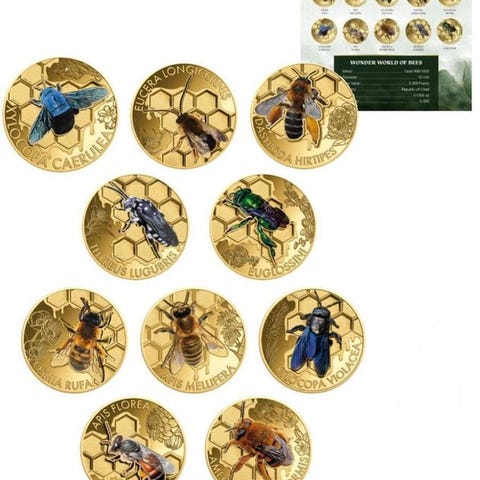 Chad udsteder et sæt af 10 mønter i 1/1000 oz af 0,999 Pure guld, på pålydende 3.000 CFA-franc, leveret med displaycase og COA, samlet vægt 10 x 1/1000 oz. Klik på den blå "gå til varen" knap, for at købe eller byde på denne vare. Den samlede pris vil blive vist inden du afgiver dit bud.