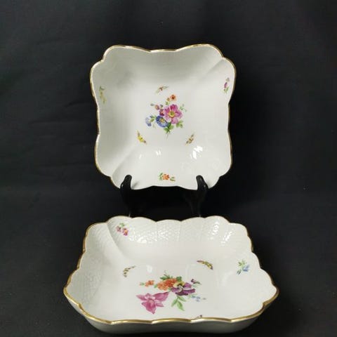 Velkommen! Vi præsenterer en saucière og en salatskål med fletmønster og blomster med sommerfugl fra KPM Berlin.