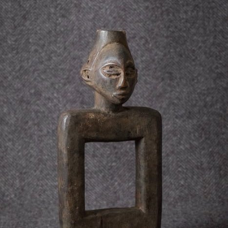 Fremstillet af træ, og den figurative lågestopper (det indvendige stykke) er lavet af teaktræ. Hvis man ser nøje på patinaen, kan man se genstandens alder!