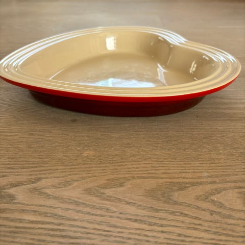 Le Creuset rundt fad i keramik. Yderside i rød farve og inderside i lys creme. Velegnet som ovnfast fad til tilberedning og servering af mad. Fadet har lav kant og glaseret overflade, som gør det nemt at rengøre. Kan bruges i køkkenet til hverdag og ved servering på bordet.