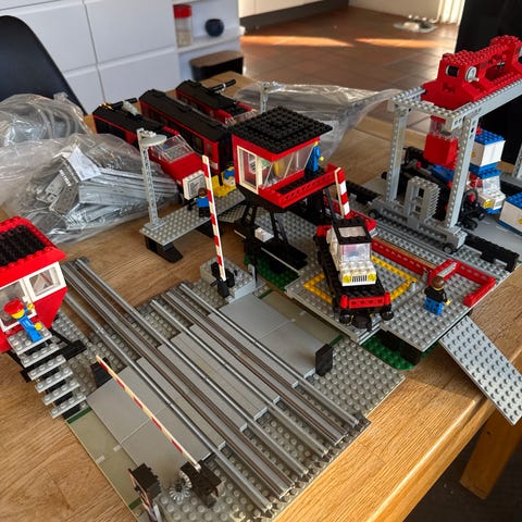 Lego sæt 7715 nu 12 volt, station 7824 sporveksel, transformator, signalstolpe og skinner.