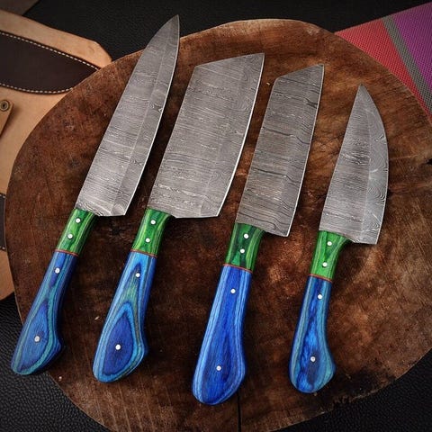 For at beskytte dine Damascus-knive mod rust, skal du sørge for at rengøre dem med en klud og påføre vegetabilsk olie efter hver brug. Lad dem ikke være våde i længere tid. Opbevar dem hele tiden olierede. Disse knive er lavet af lav- og høj kulstof Damascus-stål, ikke rustfrit stål. Du kan ikke vaske dem med vand og sætte dem tilbage i kassen. Du skal vaske dem med vand, tørre dem, SÅ påfør dem vegetabilsk olie, inden du sætter dem tilbage i kassen.