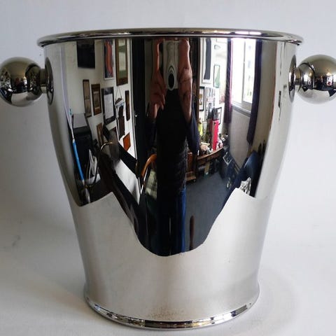 Flaskeholder udstyret med sin isbøtte, konstruktion i rustfrit stål med ydre overflade i sort satin, design Gio Ponti for Fretelli Calderoni Milano, i god behold, fra 1980’erne, diametre: 11 cm og 16,5 cm, højder: 14,5 cm og 22 cm, demonstrationsflaske ikke inkluderet, omhyggelig emballage og sporbar forsendelse, forsendelsen er kun tilgængelig inden for EU.